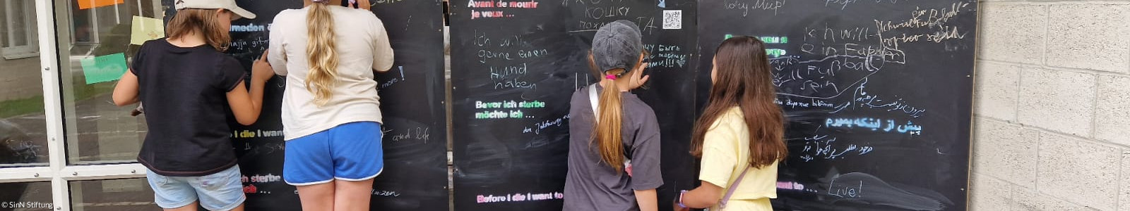 Pfarrer Thomas Amberg vom christl.-muslimischen Begegnungsprojekt „Brücke-Köprü“ setzte „Before I die, I like to…“ in einer Wanderausstellung um, die von Mai bis November 2024 durch Nürnberg kursierte. So kam die Ausstellung in der zweiten Augustwoche 2024 zum SinN-Stiftung-Kinderworkshop in die Martin Niemöller Kirche. Das Team integrierte die Tafeln in einen Workshop über Lebensträume.